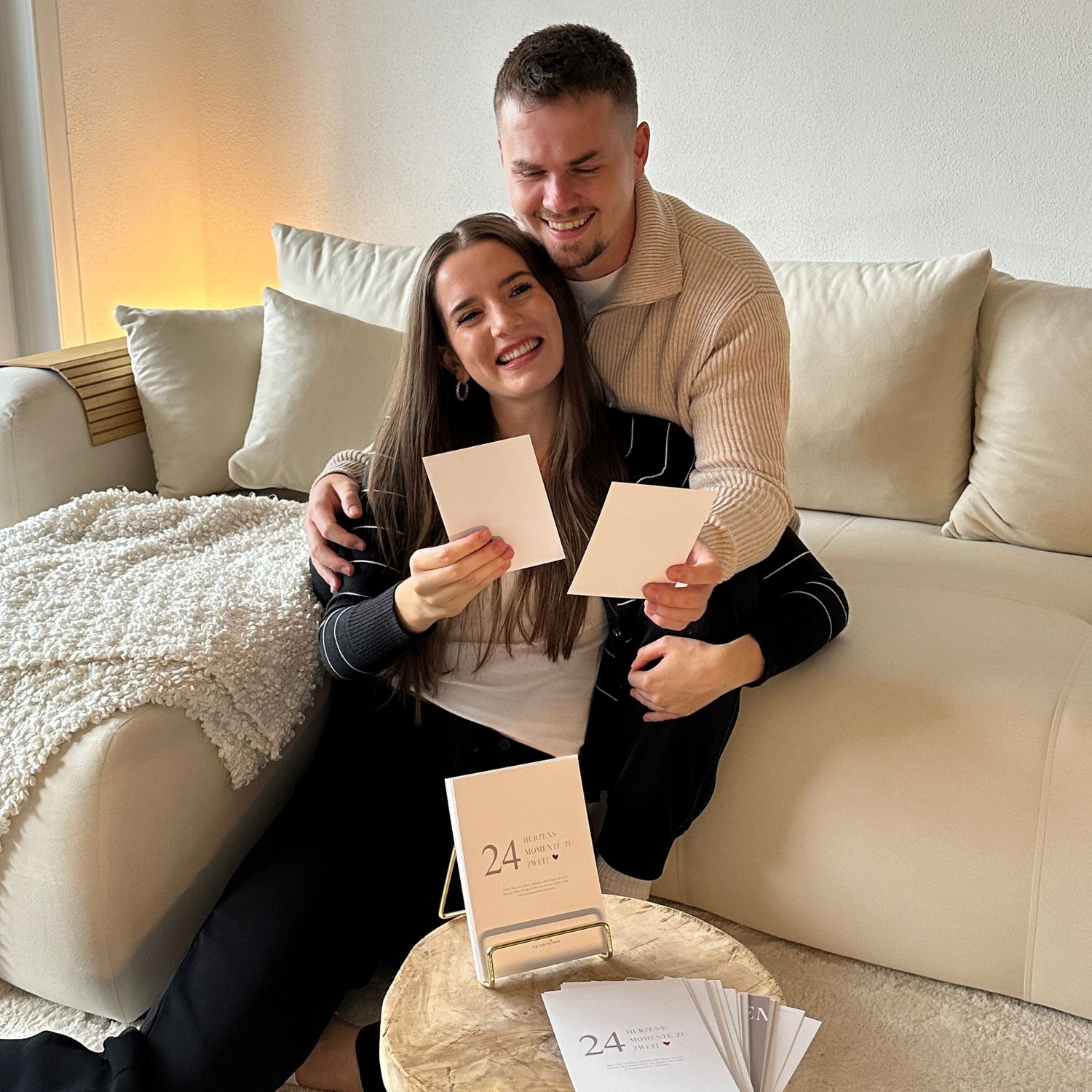 Der „Herzensidee“ Adventskalender für Paare ist darauf ausgelegt, euch beiden während der Adventszeit täglich die Möglichkeit zu geben, bewusst Zeit miteinander zu verbringen und eure Beziehung zu stärken. Der Kalender besteht aus zwei separaten Sets: Jeder von euch beiden erhält einen eigenen Satz mit 24 Karten und einem eleganten goldenen Ständer.